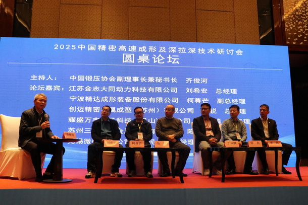 中国锻压协会副理事长兼秘书长齐俊河主持圆桌论坛,针对“1、高速精密冲压工艺、装备与模具技术难点及突破;2、深拉深工艺与装备、模具、在线监测技术的协同;3、微成形技术的应用前沿与技术瓶颈;4、复合成形技术的未来发展趋势”等议题,江苏金志大同动力科技有限公司刘希安总经理、宁波精达成形装备股份有限公司柯尊芒副总经理、创迈精密金属成型(苏州)有限公司马锐总经理、耀盛万丰电子科技(昆山)有限公司丁凤麟总经理、苏州三维精密金属制品有限公司陈利副总经理、无锡微研有限公司李民副总经理等嘉宾分享了自己及所在公司在这些方面的真知灼见。